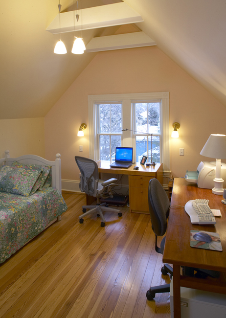 The main focus of this whole-house remodel, making the attic livable required gutting the existing space, adding a dormer for headroom to pass code at the top of the existing stairway, sprayed foam insulation and, as always, tasteful finishes.