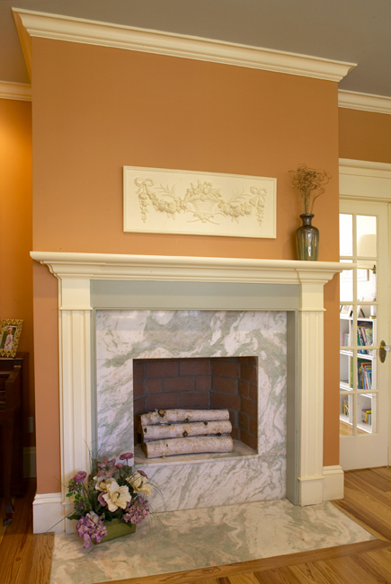 A little architectural archaeology uncovered a fireplace that had been closed-up and plastered-over. We revived it by rebuilding the inside of the firebox and constructing a new mantel and stone hearth.
