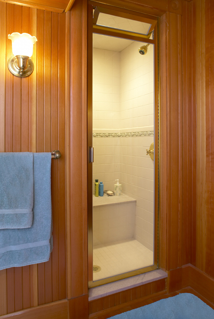 We restored this guest bathroom to its original look, although we did take liberties adding the steam shower. The fir was milled in our shop to match the existing trim and the vanity was custom built to fit a period marble top that the client acquired from a salvage yard.