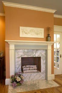 A little architectural archaeology uncovered a fireplace that had been closed-up and plastered-over. We revived it by rebuilding the inside of the firebox and constructing a new mantel and stone hearth.