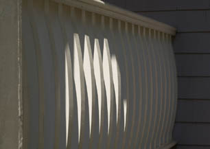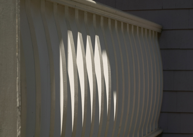 We knew we had a gem of a client when she gave us the mandate to “add whimsy.” We did just that. The swags were laid-out in the shop, lauan templates were made, shingles were cut, numbered and then taken to the site and nailed-up…no sweat. We hate mucking up a front porch with downspouts, so we buried them inside the columns. And we cut the bowed balusters ourselves.